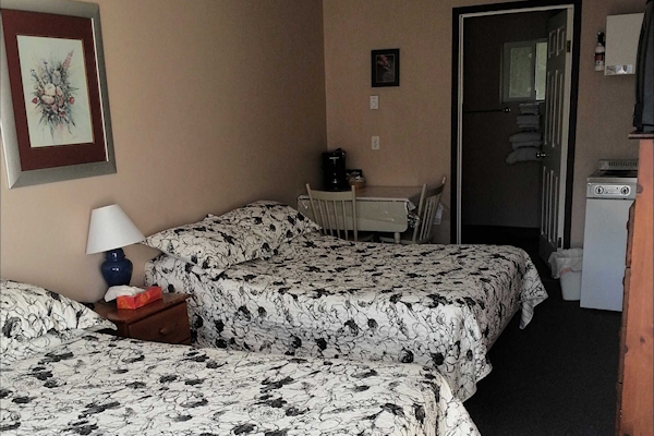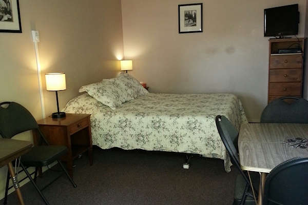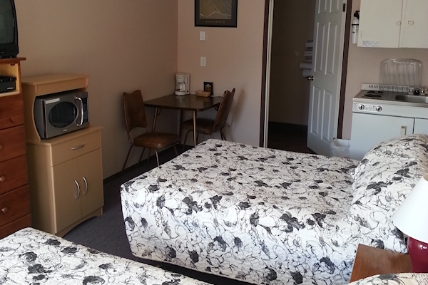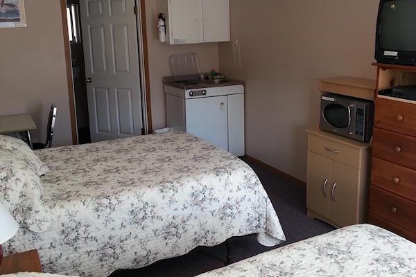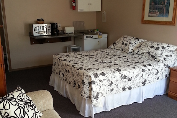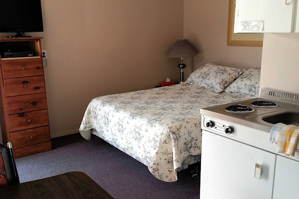 We have two single units that come equipped with a queen size bed, satellite TV and a kitchen stocked with complimentary coffee, a drip coffee maker, toaster, electric stove, microwave and various pots, pans, and dishes.
