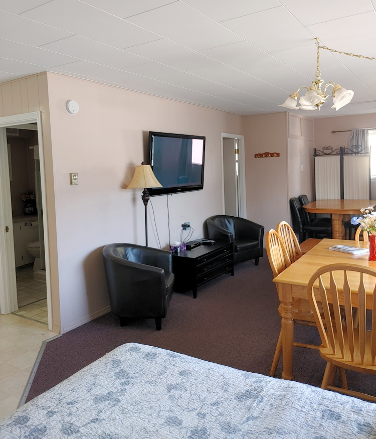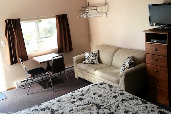 We have two single units that come equipped with a queen size bed, satellite TV and a kitchen stocked with complimentary coffee, a drip coffee maker, toaster, electric stove, microwave and various pots, pans, and dishes.